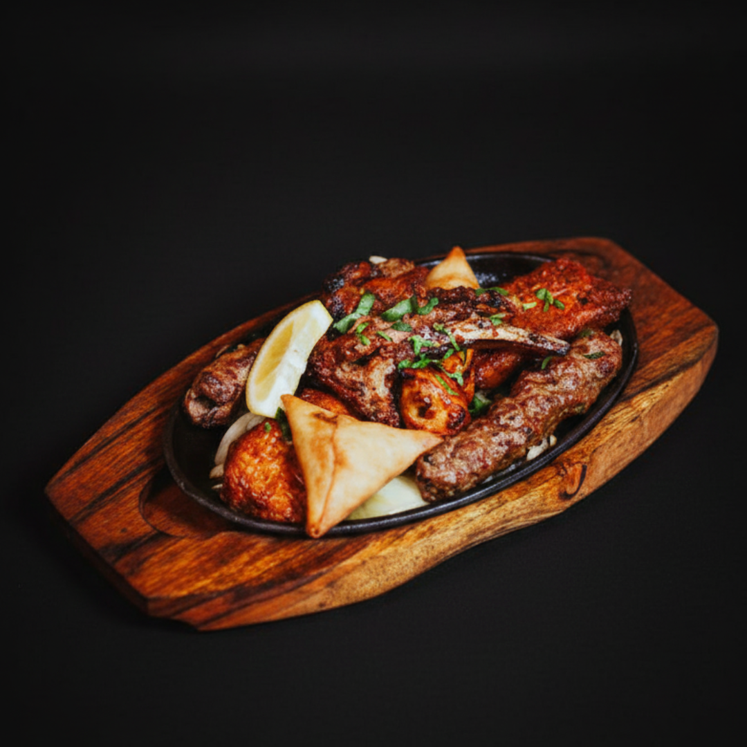 A table filling platter of chicken, lamb and seekh kebabs, all charred over live flames.